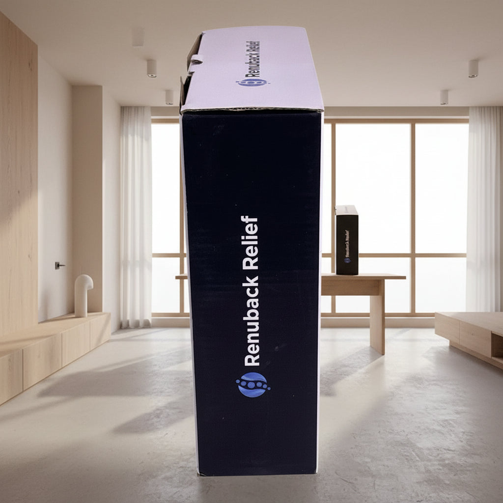 Renuback Relief posture corrector designed to improve posture and alleviate back discomfort. The ergonomic belt-style brace connects the lower back and knees, helping stabilize the pelvis to reduce slumping and support the lumbar region.